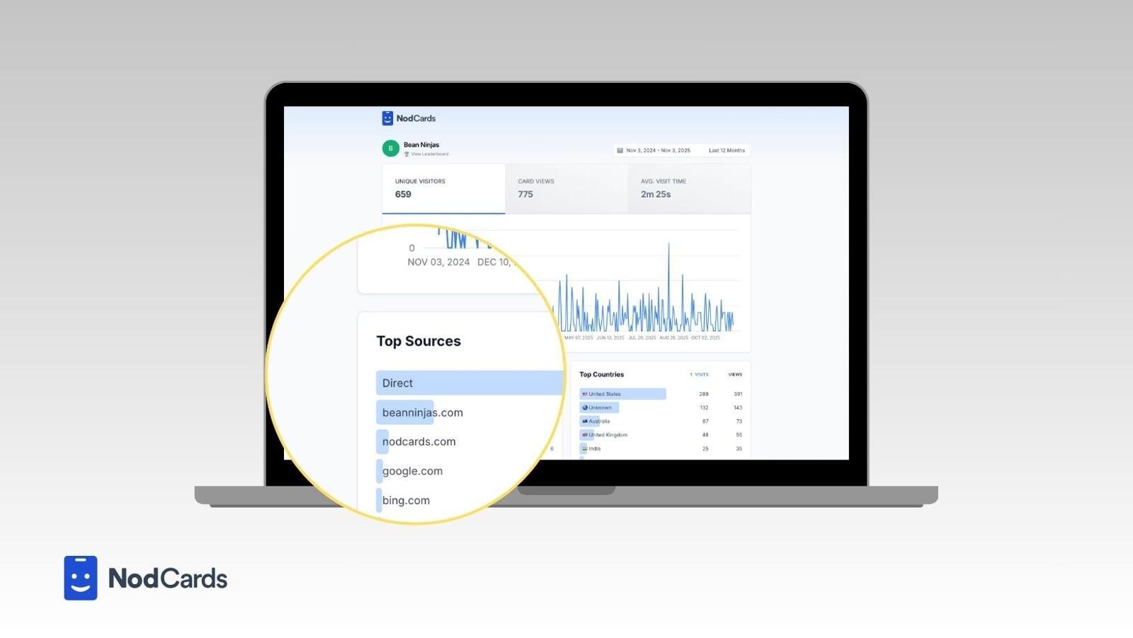 With NodCards, accounting firms can clearly see which channels are driving growth—web referrals, social media, QR codes, or email signatures. Real-time analytics reveal where new visibility and client engagement are coming from, so you can invest your marketing energy where it matters most. Finally, your brand performance becomes measurable, trackable, and easy to understand.
