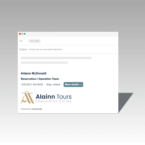 Alainn Tours is using NodCards email signature generator to effortlessly align their brand for every employee, ensuring that their contact information is always in sync and that their employees are always easy to reach.