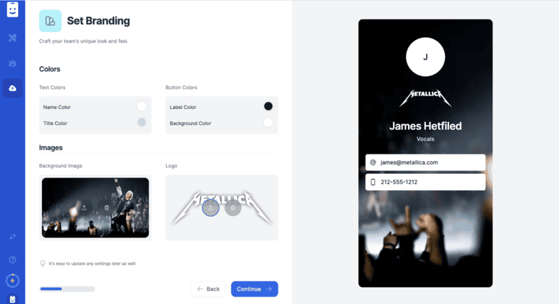 Set Branding. Upload a logo and a background image to make your brand really stand out and tell the world what you're all about. Customize the color for everyone's name, title, button and labels. Think of these like digital billboards for your brand and business. Every time one of your NodCards is found or shared online, your brand gets attention and customers can do business with you.