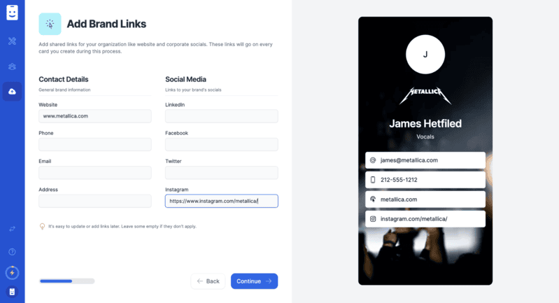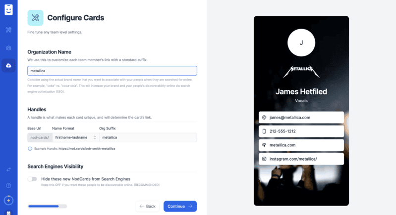 Configure Cards. Add your organization or brand name to identify your team members online in their NodCards URL. This is an important piece of your brand's marketing efforts. You should use the brand or business name that customers are most likely to search for in connection with your employees. Use the most common name for your company or business and you can't go wrong. This is also the step where you can select whether these new cards are visible to search engines (like Google and Bing). We highly recommend making your team discoverable via SEO so their NodCards show up in online searches and bring you business.