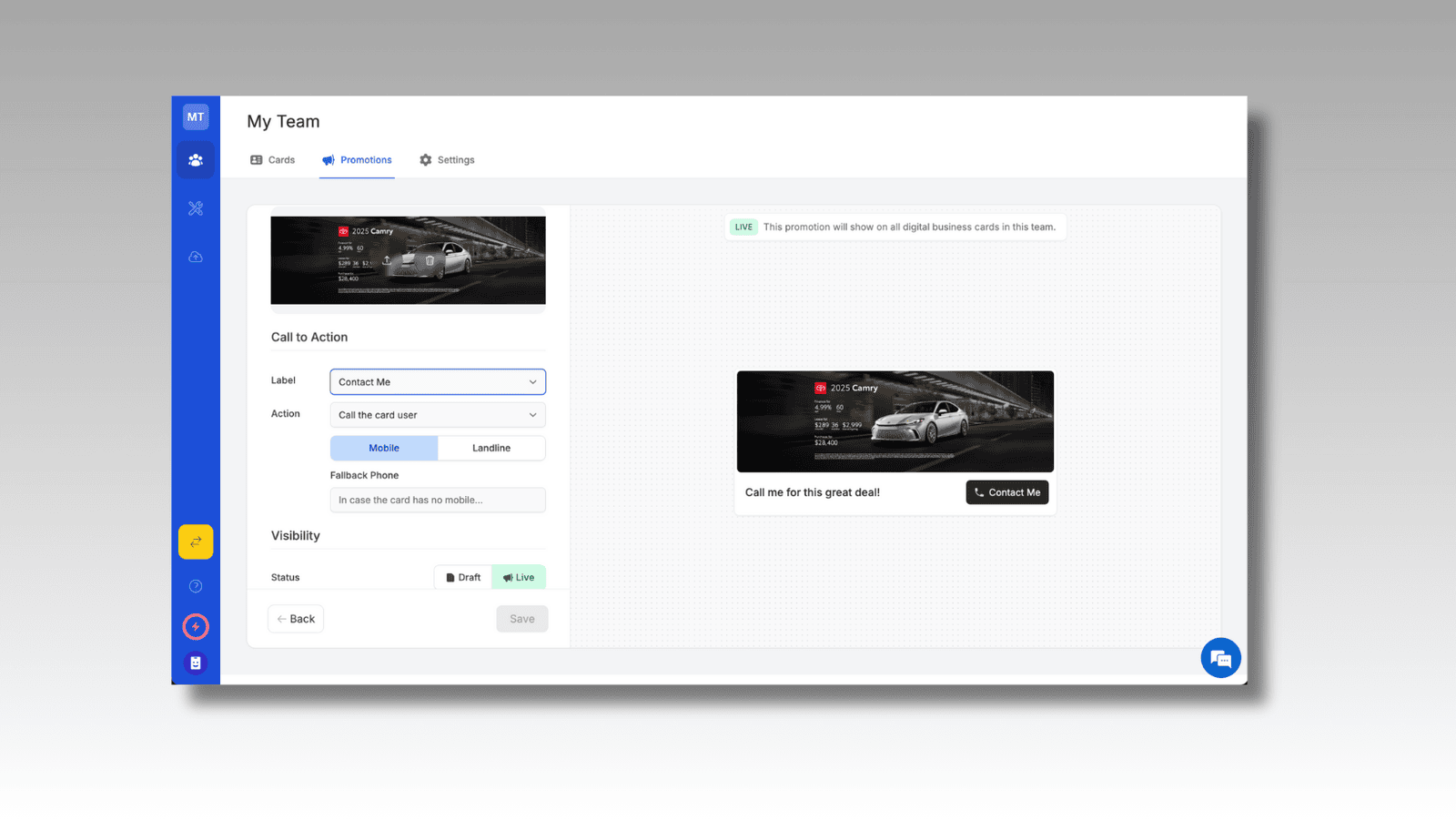 - Rotate multiple promotions between your team's digital business cards for maximum sales exposure